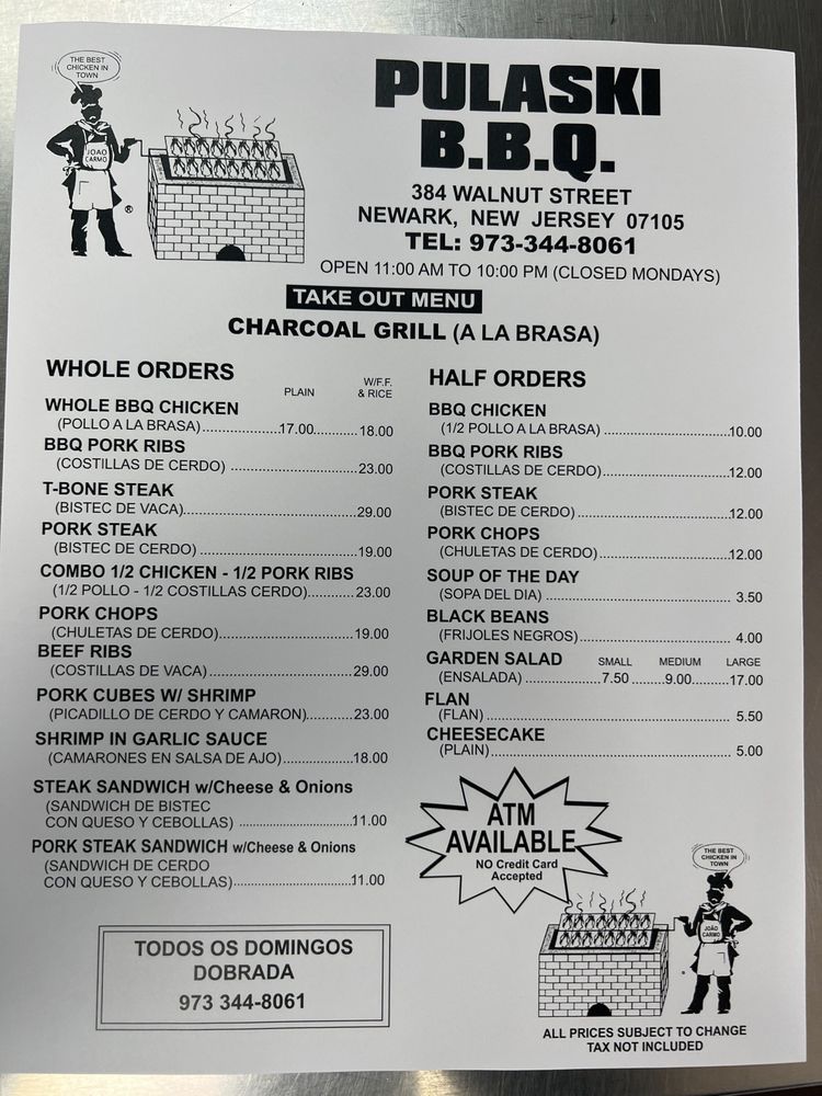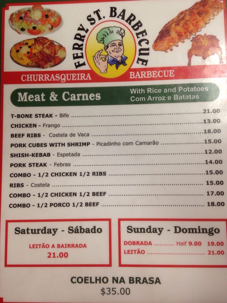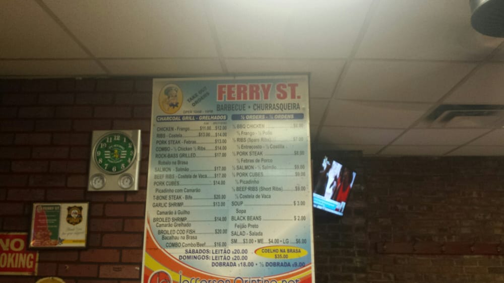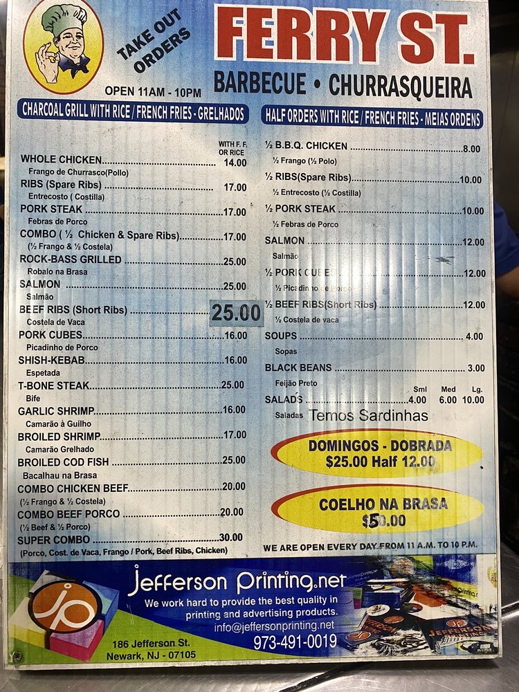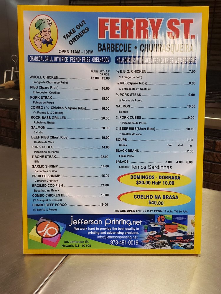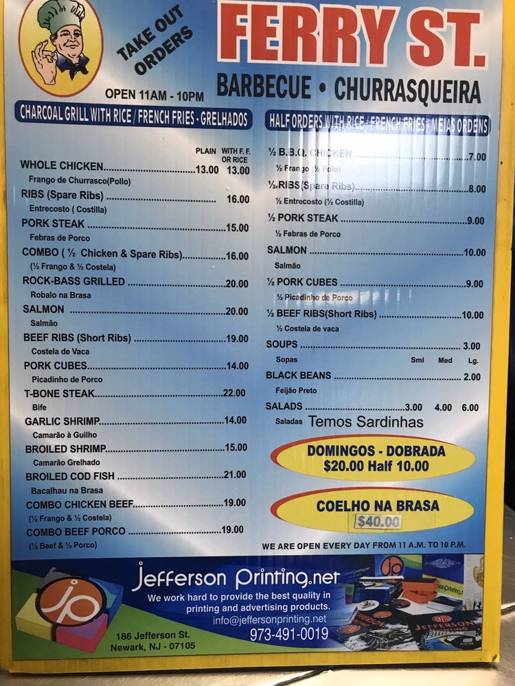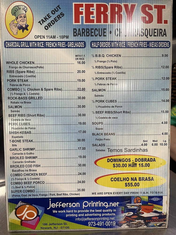 Ferry St. Barbecue in Newark, NJ offers a Portuguese-style BBQ experience with a diverse menu featuring charcoal-grilled specialties like whole chicken, ribs, pork steak, salmon, beef ribs, and more. Customers rave about the generous portions and flavorful dishes, with highlights being the beef ribs, chicken platters, and picadinho de porco. The ambiance is casual and welcoming, perfect for groups or families looking for a satisfying meal. Takeout and delivery options are convenient, catering to those on-the-go. While the menu is limited, it ensures consistently great quality and taste. Whether you're a longtime fan or a first-time visitor, Ferry St. Barbecue is a must-try destination for authentic Portuguese BBQ flavors.